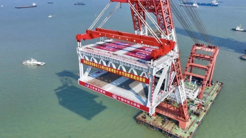 2月1日上午 中鐵大橋局承建的常泰長江大橋 主航道橋首個(gè)1280噸的鋼梁吊裝完成 巨力索具1900噸大節(jié)段鋼梁吊具 全程保障該項(xiàng)目吊裝順利進(jìn)行 贏得兔年“開門紅” 為公司實(shí)現(xiàn)一季度開門紅創(chuàng)造有利條件本次吊裝為常泰長江大橋主航道橋常州側(cè)邊跨首個(gè)大節(jié)段鋼梁,更是全橋首個(gè)大節(jié)段鋼梁,此次鋼梁吊裝完成,標(biāo)志著常泰長江大橋建設(shè)又邁出堅(jiān)實(shí)的一步。鋼梁吊裝至滑移支架上后,將通過拖拉滑移系統(tǒng)拖拉300m至設(shè)計(jì)位置。