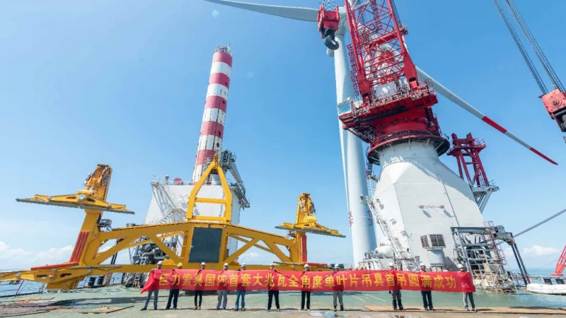 近日,汕頭某海域,巨力索具研發的國內首臺50噸大兆瓦全角度旋轉式海上單葉片吊具,剛剛面世,便展開連續作業,順利完成5臺風機的葉片吊裝,經受住了考驗,完美的展示了巨力吊具的高可靠性、高安全性及高效率。