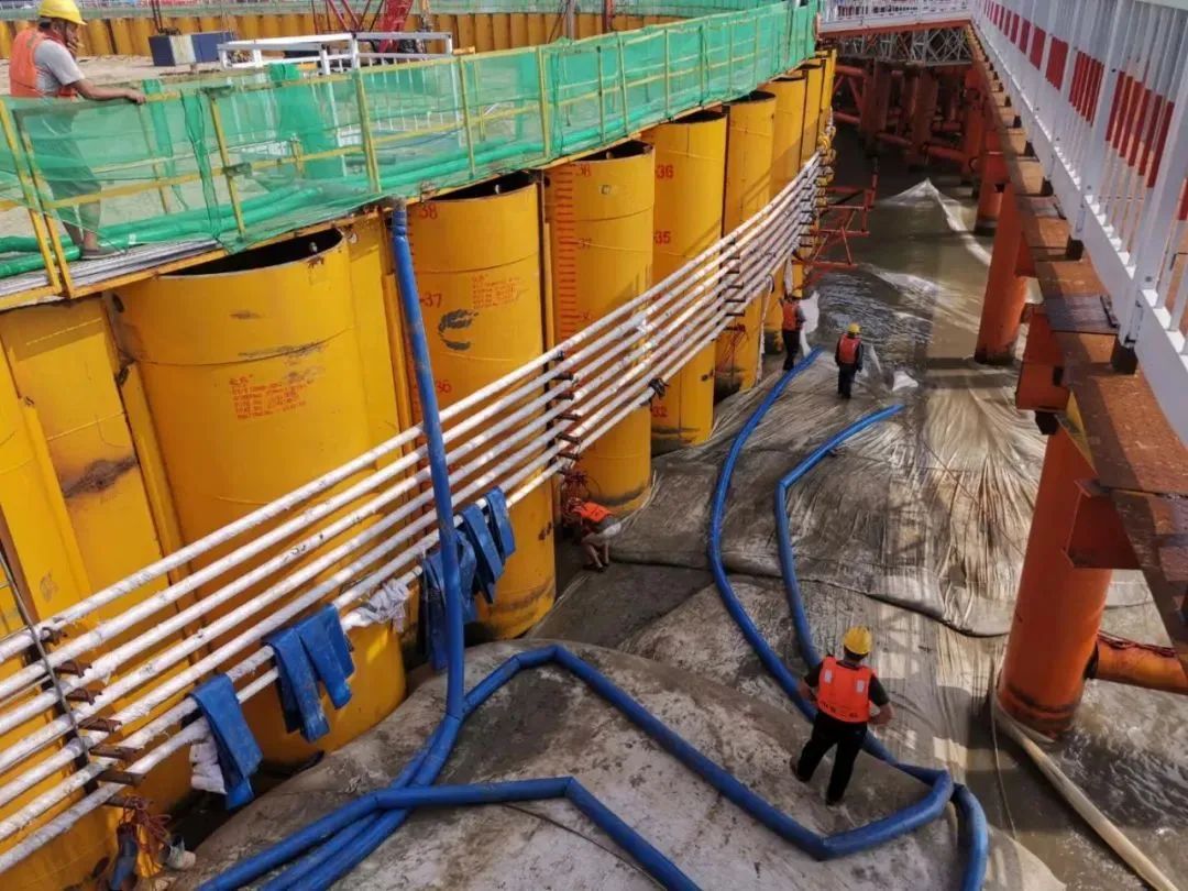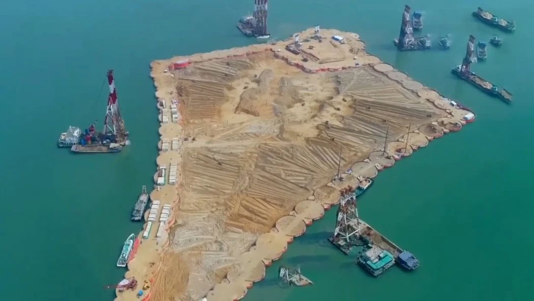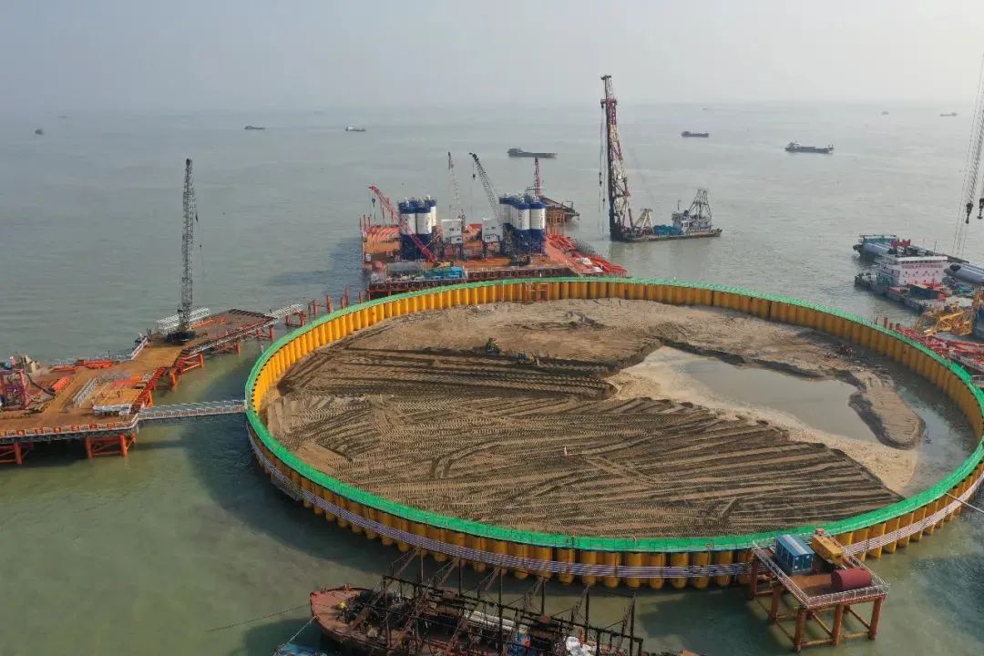 2017年9月18日,隨著最后一根鋼圓筒振沉到位,57個(gè)鋼圓筒,每個(gè)直徑28米、高35-40米,重達(dá)650噸全部精準(zhǔn)牢固地打入海底巖層中。西人工島外圈圍堰如珠玉般勾勒出“海上鯤鵬”。僅用4個(gè)半月,在寬闊的伶仃洋中間,憑空筑起一座相當(dāng)于19個(gè)足球場(chǎng)大小的人工島,刷新了快速成島的世界紀(jì)錄。
