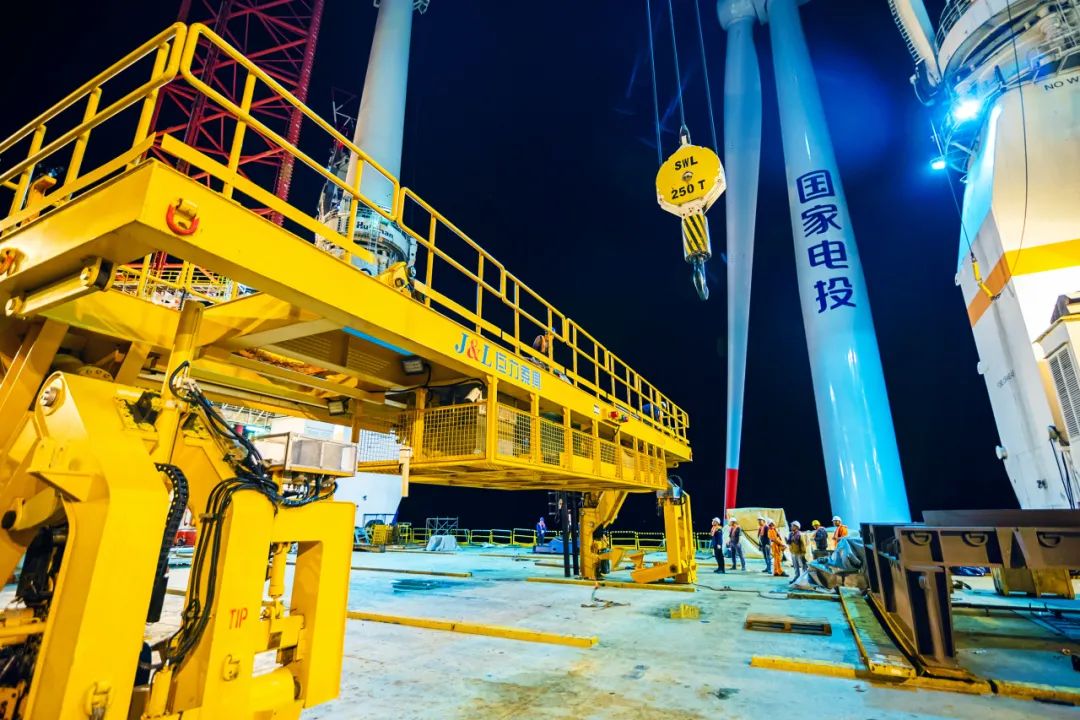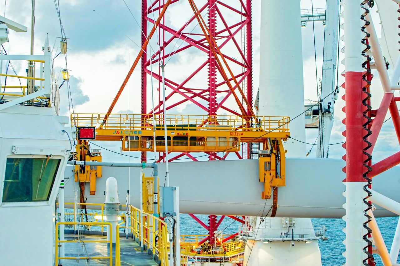 2021年8月19日,華能山東半島南4號海上風電項目順利完成首臺風機“整體”吊裝,風機整體最大重量為650噸,該吊裝設備包括運輸?shù)鬃?、井字架、平衡梁、電氣系統(tǒng)、液壓系統(tǒng)、緩沖系統(tǒng)等部件構成,是巨力索具在北方沿海地區(qū)海上風電首個風機整體吊裝項目。開創(chuàng)了國內(nèi)海上風電實施5.0兆瓦以上單樁基礎風機整體吊裝先河。