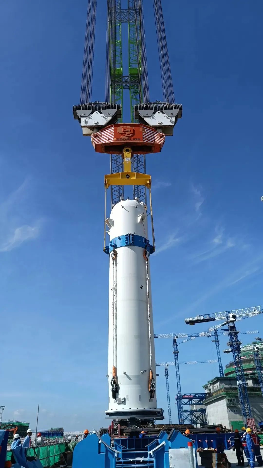 2022年7月,“華龍一號(hào)”漳州核電2號(hào)機(jī)組首臺(tái)蒸汽發(fā)生器(一環(huán)路)經(jīng)過翻轉(zhuǎn)、提升、變幅等一系列既定工序,順利吊裝就位。本次吊裝采用“主設(shè)備先行引入法”將蒸發(fā)器成功引入核島內(nèi)部結(jié)構(gòu),巨力索具核電專用吊具全程保障吊裝過程順利進(jìn)行,為后續(xù)2號(hào)機(jī)組穹頂?shù)跹b創(chuàng)造了有利條件。