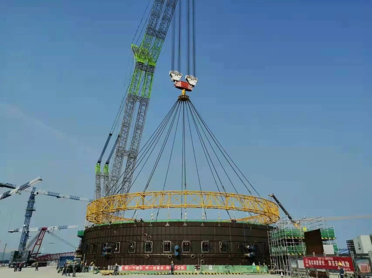 2022年1月,漳州核電2號(hào)機(jī)組核島鋼襯里模塊七吊裝成功,巨力索具為該項(xiàng)目提供牛腿模塊環(huán)形吊具、鋼絲繩索具、無接頭繩圈等相關(guān)配套索具,全程保障吊裝環(huán)節(jié)順利進(jìn)行。吊裝過程質(zhì)量安全整體受控,實(shí)現(xiàn)了鋼襯里筒體、牛腿和次鋼平臺(tái)一體化模塊施工,標(biāo)志著“華龍一號(hào)”鋼襯里模塊化施工又有新突破,開創(chuàng)了國內(nèi)外核電機(jī)組鋼襯里全模塊化施工建造的先河。