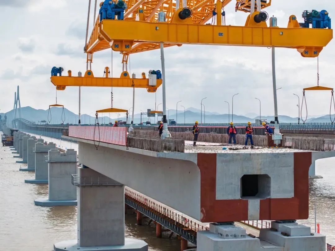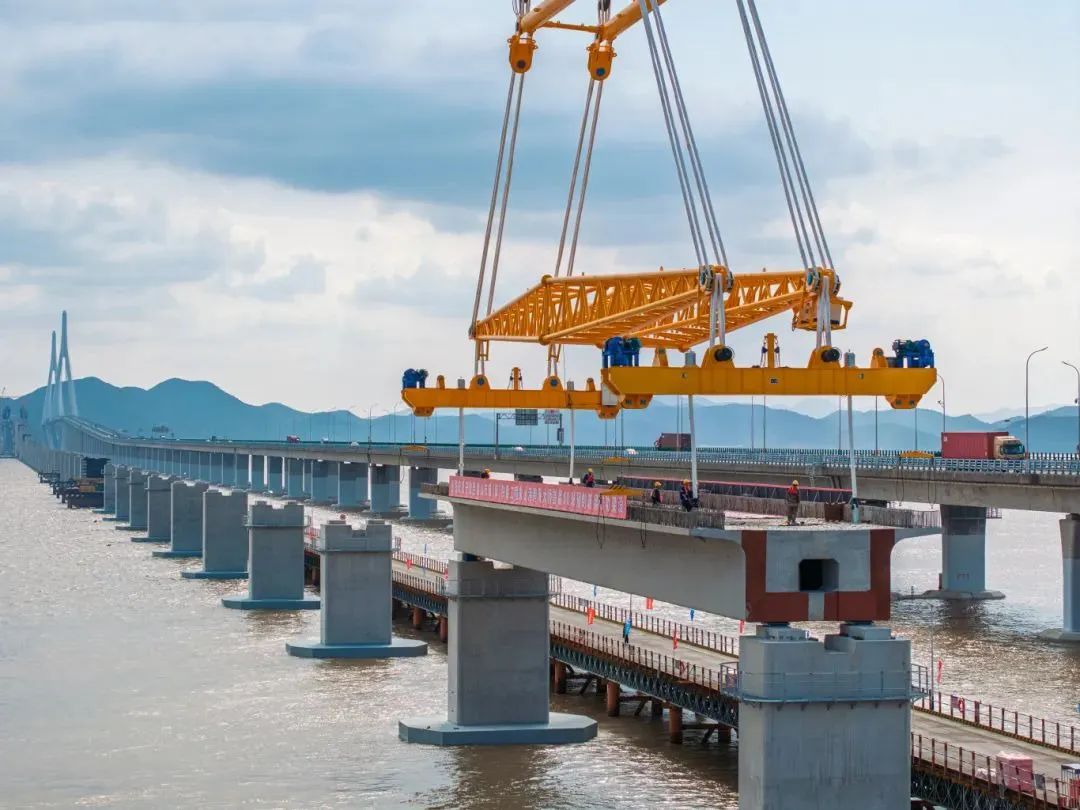 11月5日,隨著現(xiàn)場指揮一聲令下,國內(nèi)首座市域(郊)鐵路跨海大橋,重1700噸的預制箱梁穩(wěn)穩(wěn)落至橋墩上,巨力索具箱梁吊具全程保障首榀箱梁成功架設(shè),標志著大橋全面進入上部結(jié)構(gòu)施工階段。