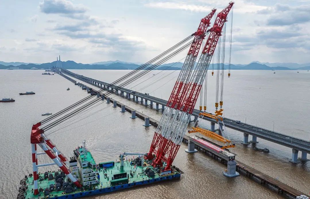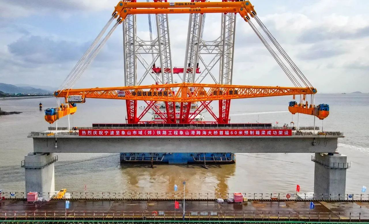 大橋海上架設(shè)預制箱梁共66榀,每榀梁長60米,寬10.6米,重約1700噸,吊具重280噸,總體起吊總重1980噸,是國內(nèi)市域(郊)鐵路工程跨度最大、噸位最重的預應力混凝土預制箱梁。