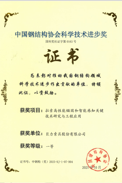 近日,2025年度中國(guó)鋼結(jié)構(gòu)協(xié)會(huì)科學(xué)技術(shù)進(jìn)步獎(jiǎng)評(píng)審結(jié)果揭曉。在10月14日于廣西南寧舉行的頒獎(jiǎng)典禮上,巨力索具股份有限公司憑借卓越的技術(shù)研發(fā)實(shí)力,一舉斬獲三項(xiàng)一等獎(jiǎng),充分彰顯了公司在高端索具技術(shù)領(lǐng)域的創(chuàng)新引領(lǐng)地位。