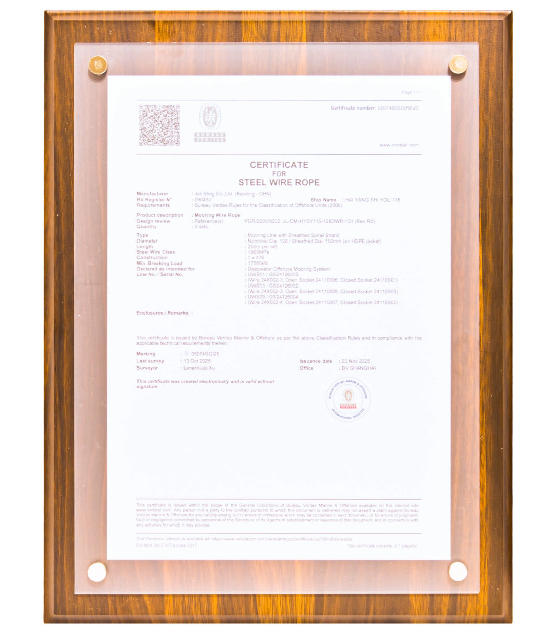這張證書標志著中國首條打破國際壟斷的深海系泊鋼纜正式誕生,這不僅是對巨力索具技術實力的認可,更是中國海洋油氣開發領域系泊索、索節、卸扣國產化替代的零的突破。
