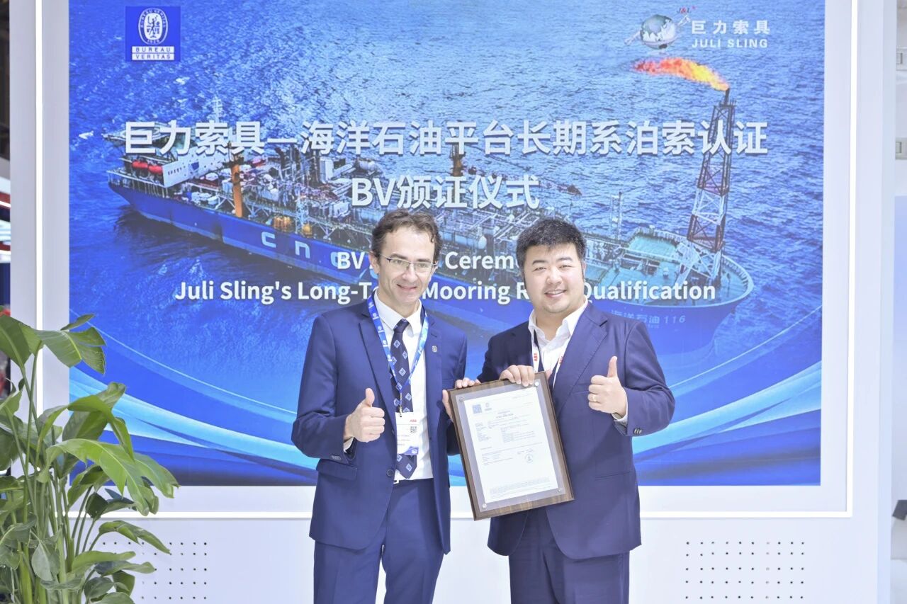 在2025中國國際海事會展期間,法國船級社(BV)向巨力索具頒發(fā)了“海洋石油平臺長期系泊索”專項(xiàng)認(rèn)證證書。這項(xiàng)認(rèn)證是針對海洋石油平臺長期系泊索這一技術(shù)門檻領(lǐng)域的專項(xiàng)認(rèn)證,是對巨力索具深耕深海裝備技術(shù)的最佳注腳。