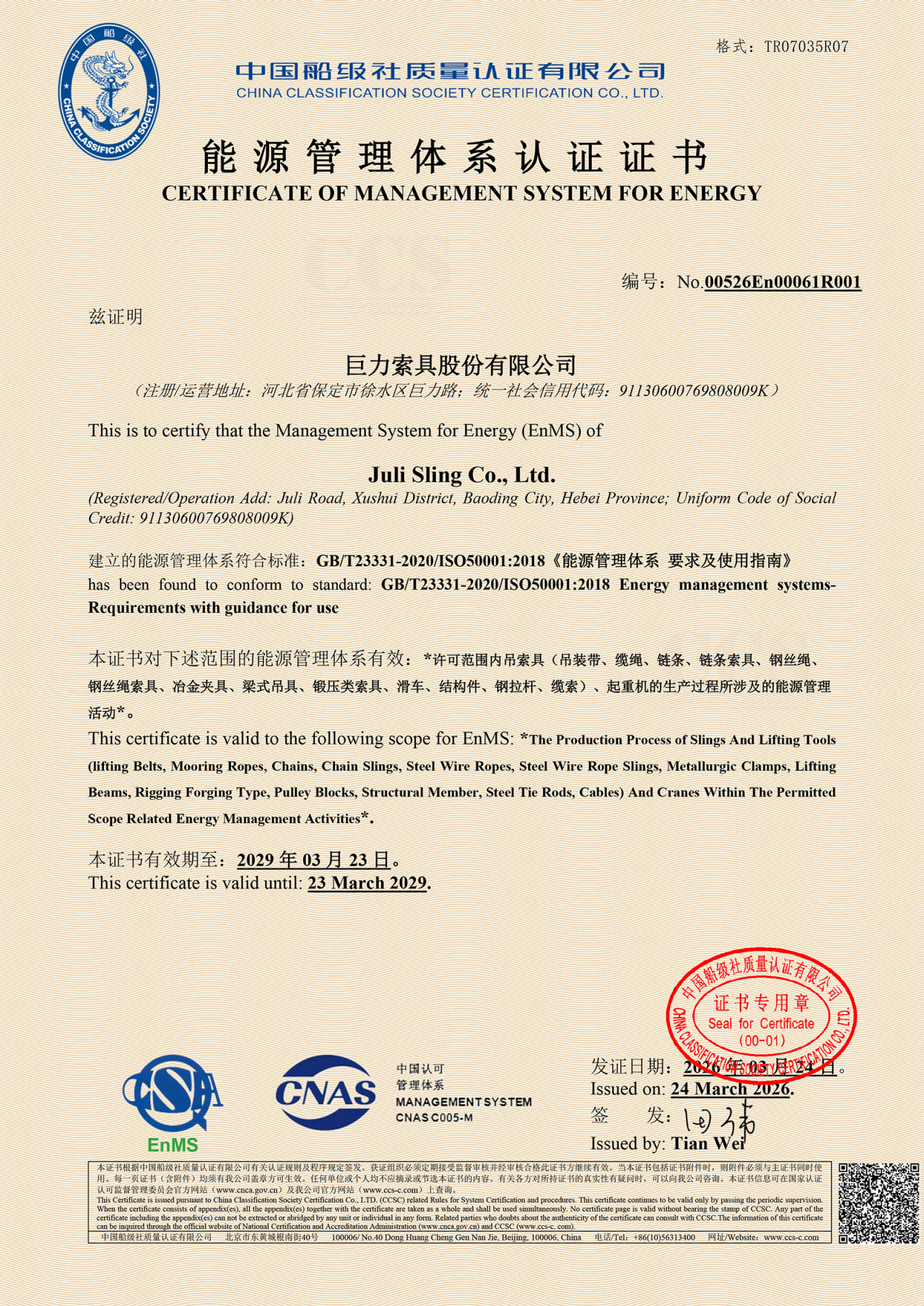 官宣 | 巨力索具斬獲中國船級社(CCS)能源管理體系認(rèn)證證書!