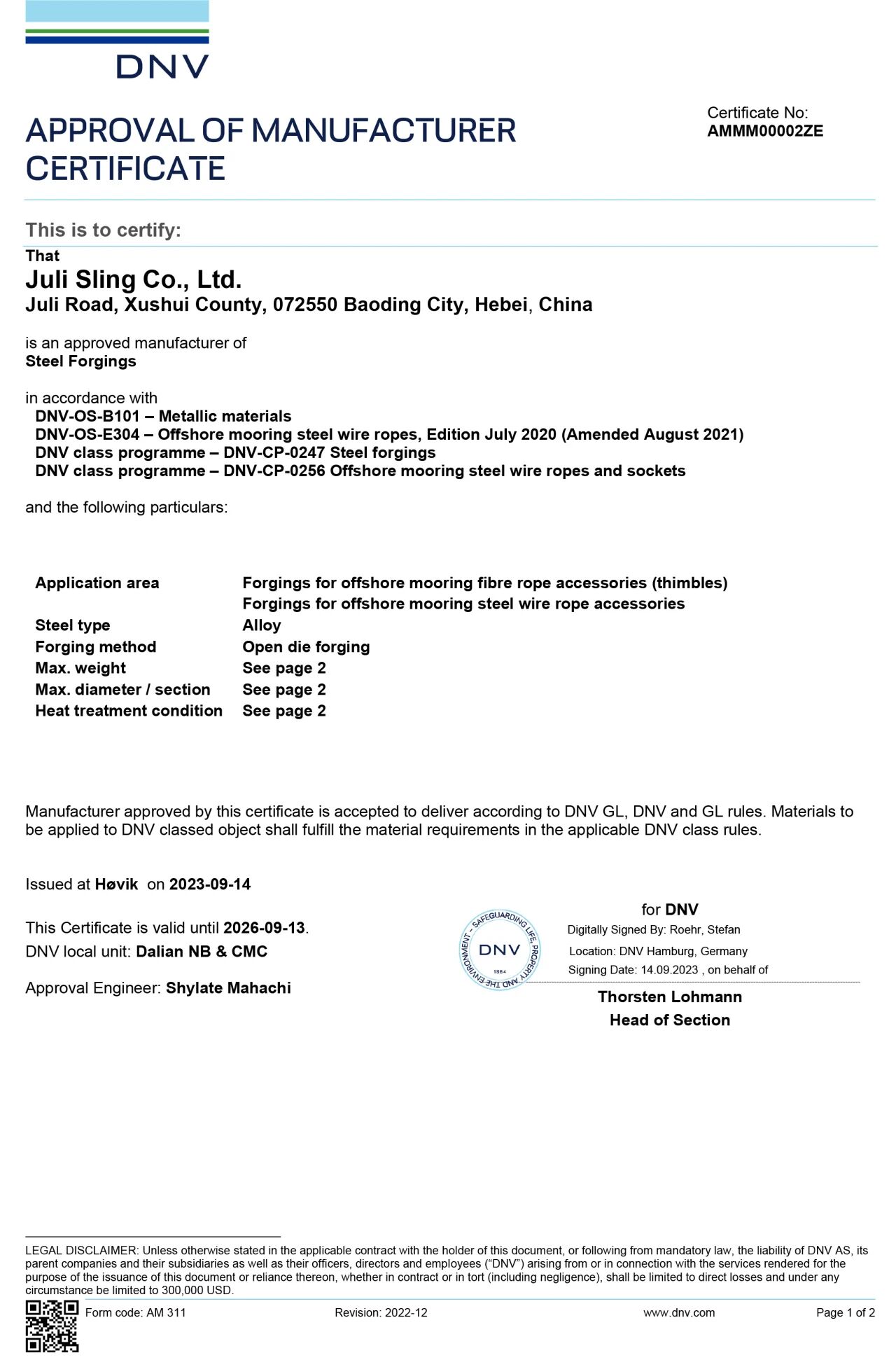 巨力索具先后取得挪威船級社(DNV)多項(xiàng)認(rèn)證,逐步構(gòu)建起較為完整的系泊產(chǎn)品認(rèn)證體系。△ DNV焊接工廠認(rèn)可證書△ 永久系泊用單股涂塑鋼絲繩的DNV·GL工廠認(rèn)可證書△ DNV長期系泊鋼絲繩接頭及纜繩套環(huán)鍛件工廠認(rèn)可證書
