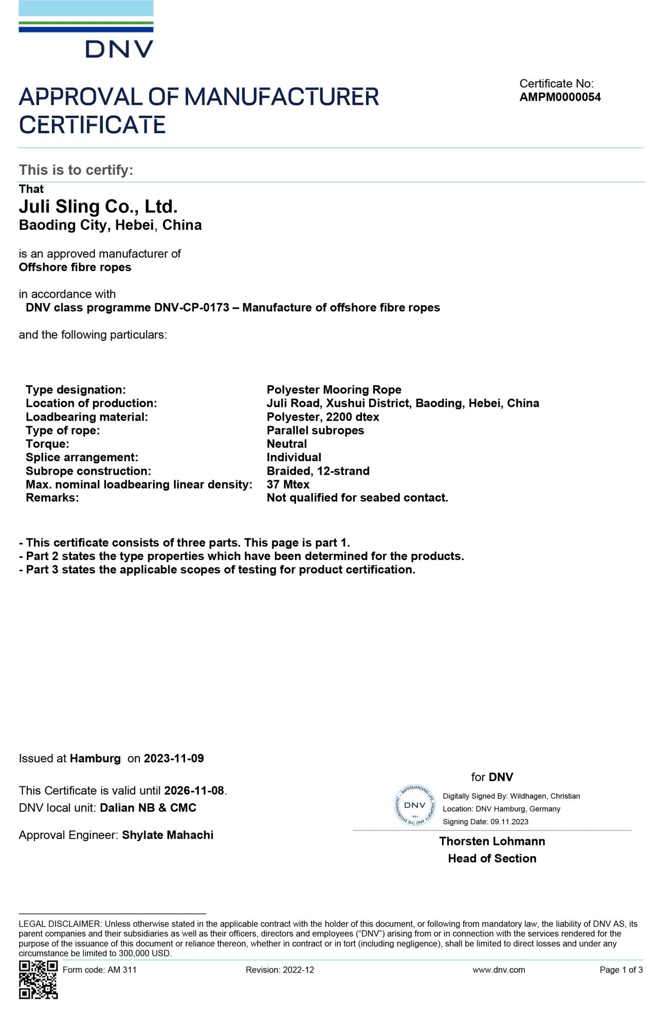 △ DNV長期系泊纜繩(滌綸)工廠認(rèn)可證書法國船級社(BV)