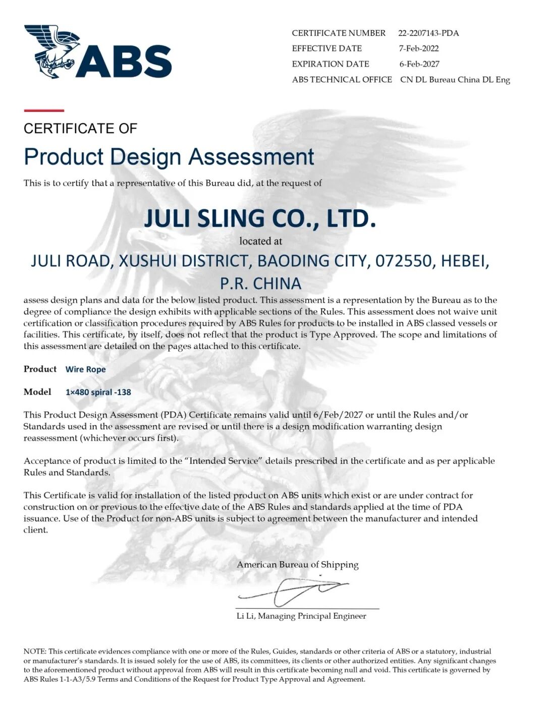 △ 美國船級社(ABS)單股鋼絲繩ABS設(shè)計(jì)評估證書