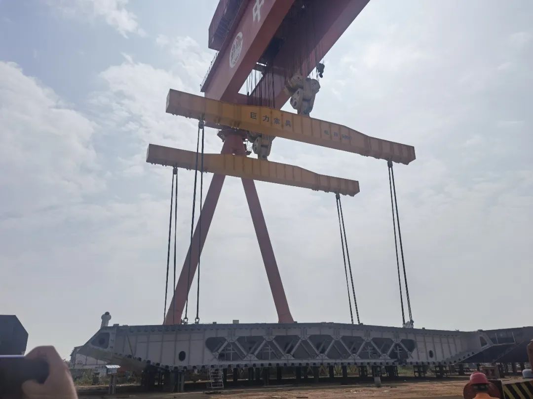 11月19、20日,長133米,寬20米,高4.7米,重1700噸的大型鋼箱梁段運至指定位置,巨力索具研發制造的鋼箱梁吊具全程保障該項目吊裝順利實施,標志著深中通道G05標段泄洪區鋼箱梁大節段XG9L出海平臺在中鐵山橋南方裝備試運行成功。此次成功試運行為深中通道鋼箱梁大節段順利啟運奠定了堅實基礎。
