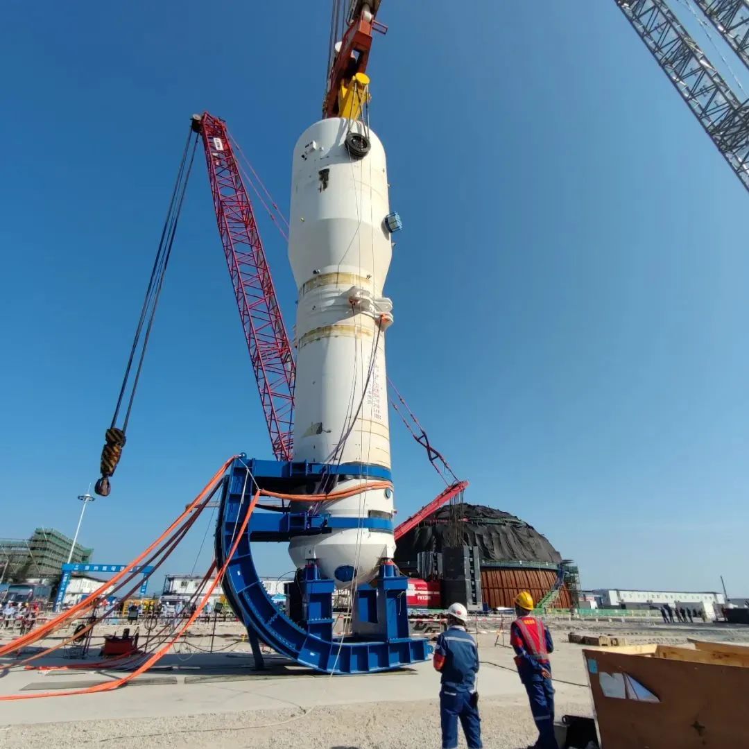 ZH-65型蒸汽發(fā)生器是華龍一號機組最核心的設備之一,它的體積巨大,結構復雜而精細,自接到吊裝任務,巨力索具項目團隊首先清晰形勢和任務,統(tǒng)一大局意識和服務意識,明確各階段吊裝目標和方向,吊裝方案采用新型翻轉裝置,該裝置利用重力和杠桿原理,無需特殊固定措施就能使主設備和翻轉支架形成一個整體,對比傳統(tǒng)的固定支架安裝調整以及安裝、拆卸抱環(huán)等工序,操作容易、安全性高,人因失誤概率低,極大提升了施工效率和安全。