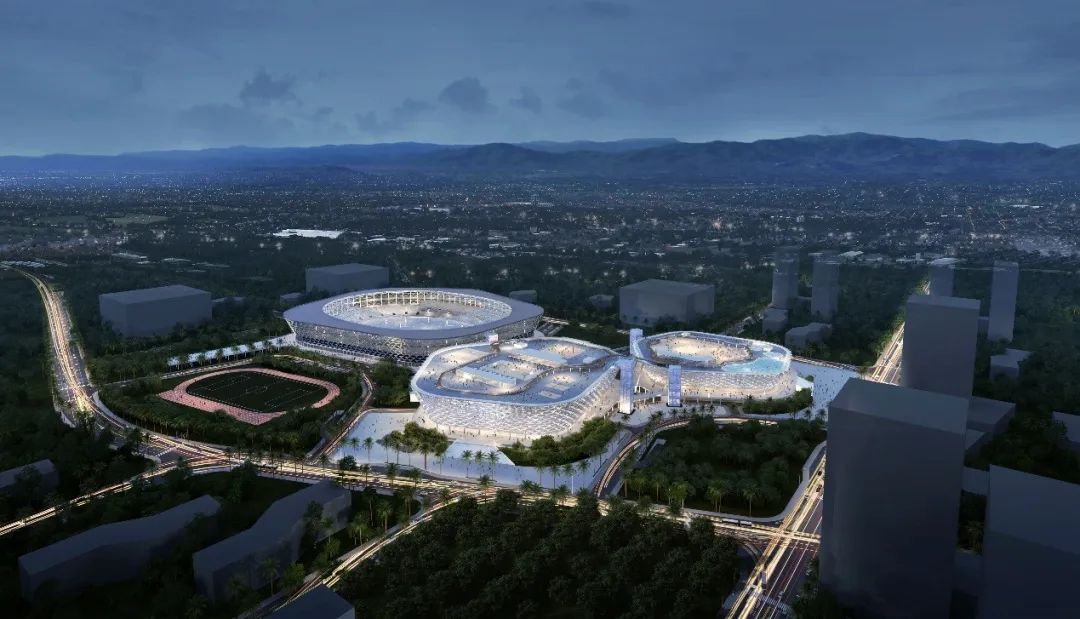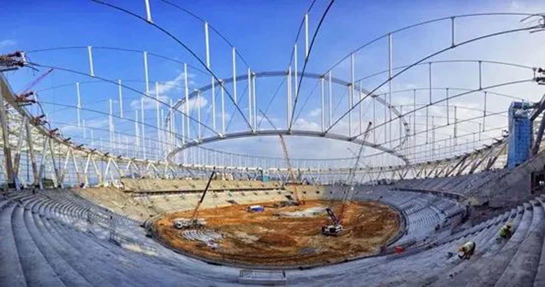 該體育場整體外輪廓平面投影為不規(guī)則的倒角五邊形,其外輪廓南北最大長度約305米,東西約270米,罩棚最高點標(biāo)高約46米。從體育場內(nèi)的觀眾席處仰望,一根根鋼索交織連接,各自用力拉伸,巨大鋼網(wǎng)架躍然呈現(xiàn),好似一座兼具了力學(xué)、美學(xué)、科技的藝術(shù)品。